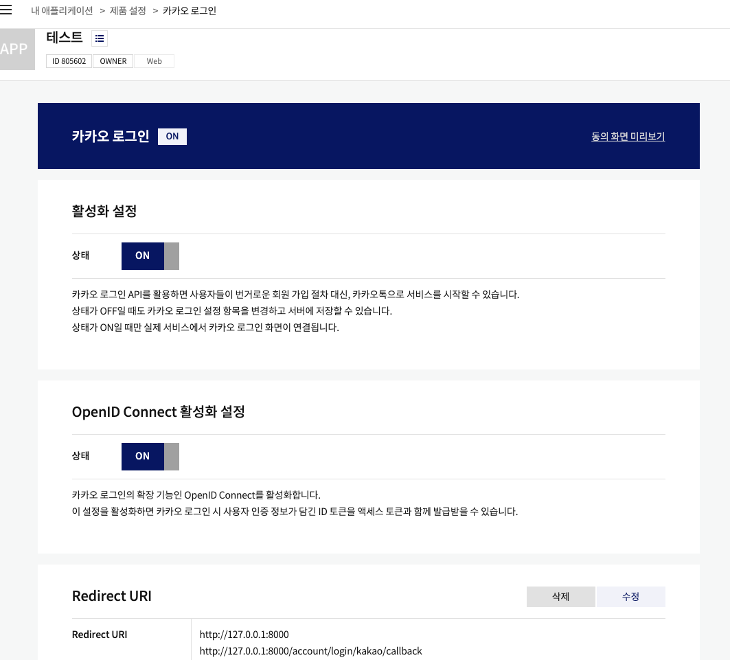 5-3) 카카오 developers에서 로그인 활성화 & redirect uri 등록하기