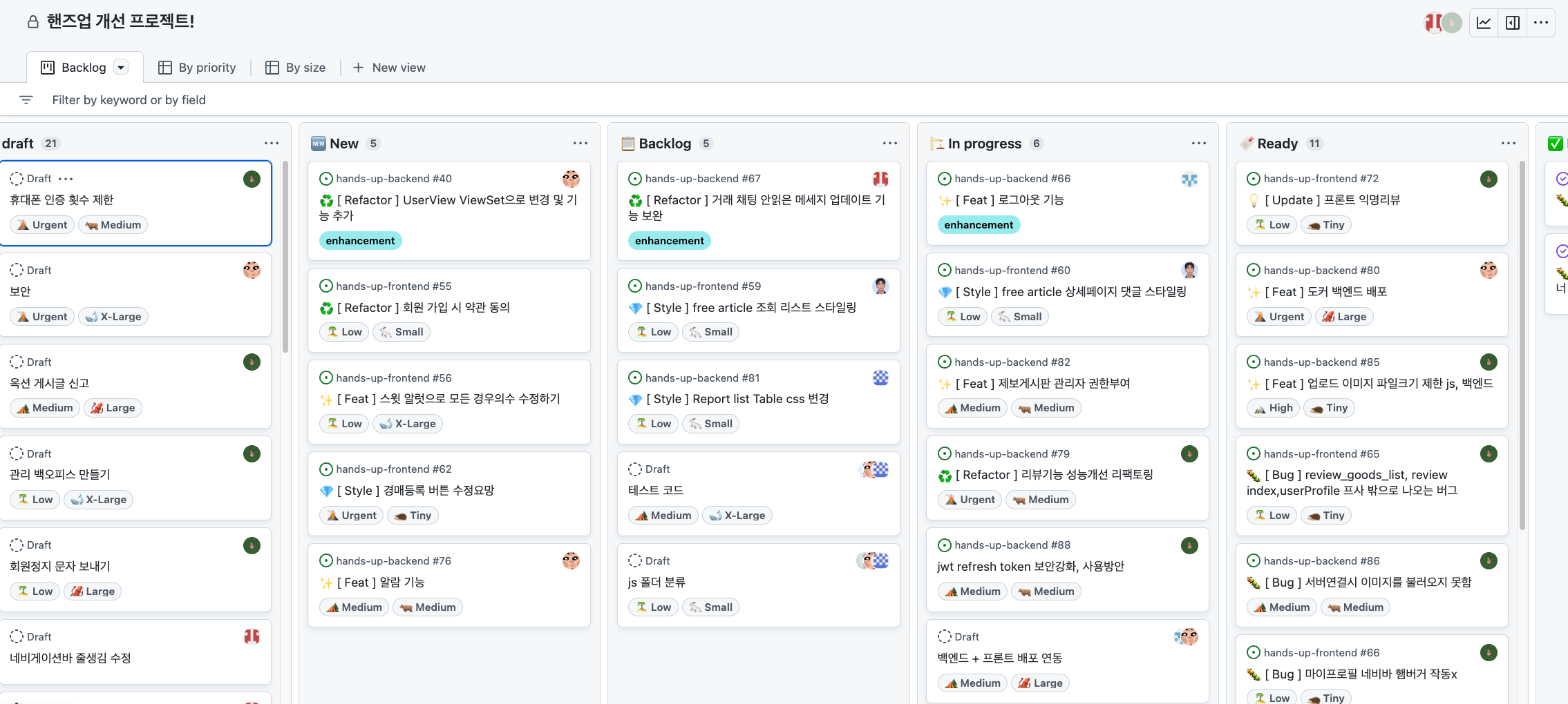 프로젝트 중간 발표가 끝나고 이제 배포와 피드백을 받고 프로젝트를 보완하고 발전하려는 작업을 남기고 있었고 더 나은 협업을 위해서 깃허브의 프로젝트를 활용하자고 하였다. 서로의 이슈에 대해서 논의할 수 있고 얼마나 진행됐는지와 어떤 방식으로하면 좋을 지에 대해서 논의 할 수 있는 것이 마음에 들어서 제안을 하였고 다행스럽게도 좋게 봐주셨다.